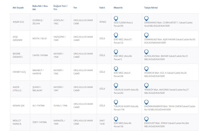 Kayseri’de bugün vefat edenler (17 Temmuz)