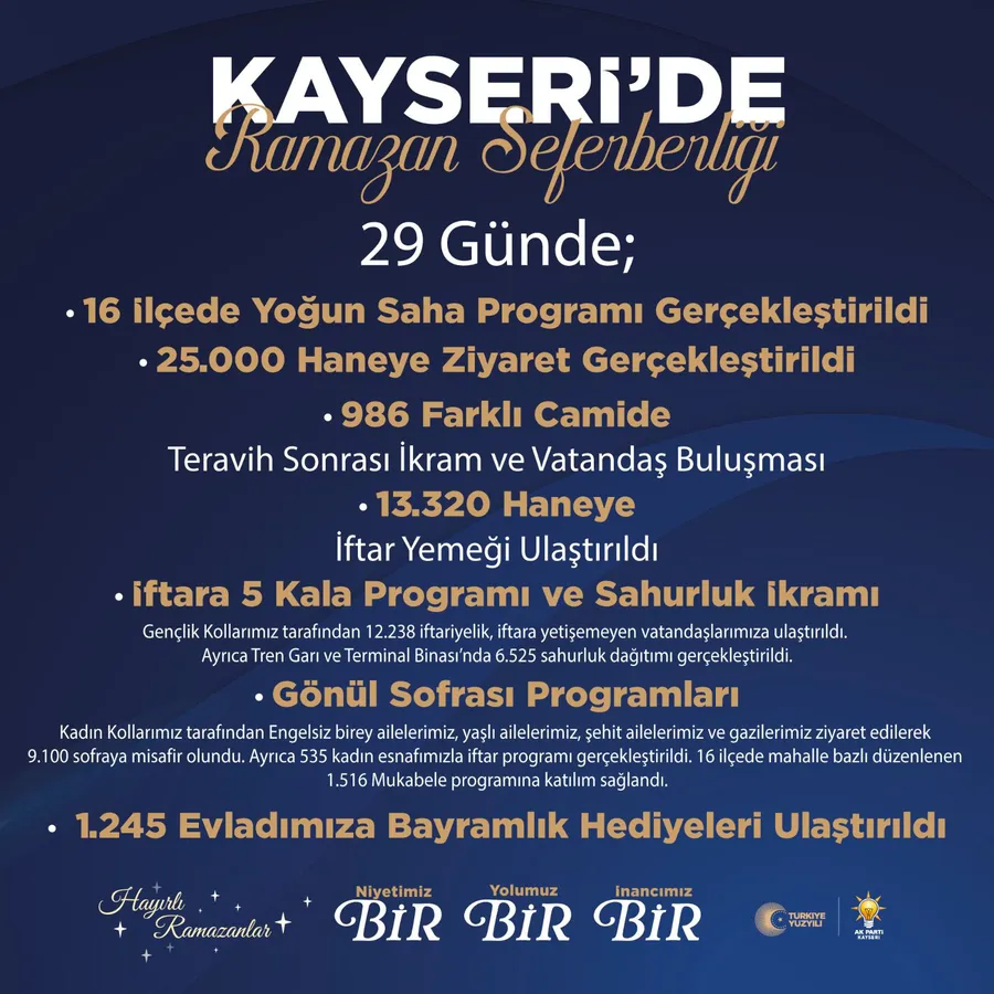 AK Parti Kayseri İl Başkanlığı, Ramazan ayı boyunca kent genelinde yürütülen çalışmalarla ilgili faaliyet raporunu paylaştı. Yapılan açıklamada, teşkilatın 29 gün boyunca şehrin dört bir yanında sahada olduğu vurgulandı.