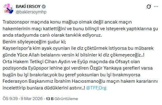 MHP Kayseri Milletvekili Baki Ersoy, Kayserispor maçındaki hakem kararlarına tepki göstererek taraftarlara çağrıda bulundu.