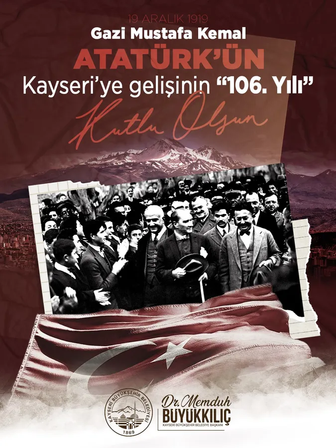 Kayseri Büyükşehir Belediye Başkanı Dr. Memduh Büyükkılıç, Atatürk’ün Kayseri’ye gelişinin 106’ncı yıl dönümünde yayımladığı mesajda, kentin Millî Mücadele’deki tarihi rolüne dikkat çekerek Cumhuriyet vurgusu yaptı.