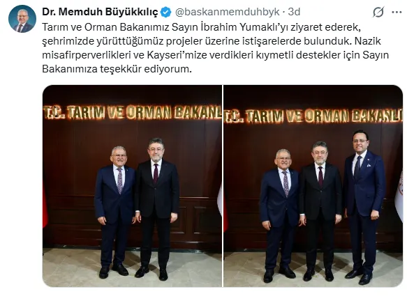 Ziyaret sonrası değerlendirmede bulunan Büyükkılıç, Bakan Yumaklı’nın Kayseri’ye gösterdiği ilgi ve desteklerden dolayı teşekkür etti. Başkan Büyükkılıç, nazik misafirperverliği ve şehre verilen katkıların kıymetli olduğunu ifade etti.