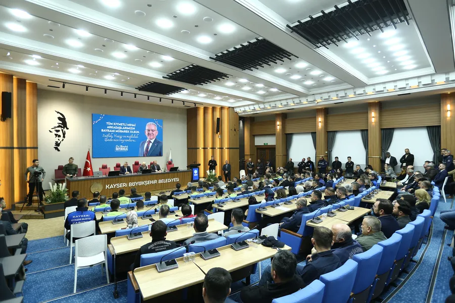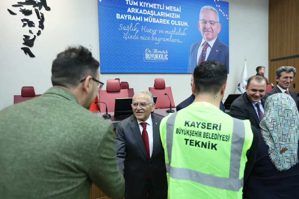 Kayseri Büyükşehir Belediye Başkanı Dr. Memduh Büyükkılıç, Ramazan Bayramı sonrası ilk mesai gününde, bayram süresince fedakârca görev yapan belediye personeliyle bayramlaştı. Başkan Büyükkılıç, Kayseri Büyükşehir Belediyesi’nin bir marka olduğunu belirterek, personeline "Tebessümü yüzünüzden eksik etmeyin" dedi.