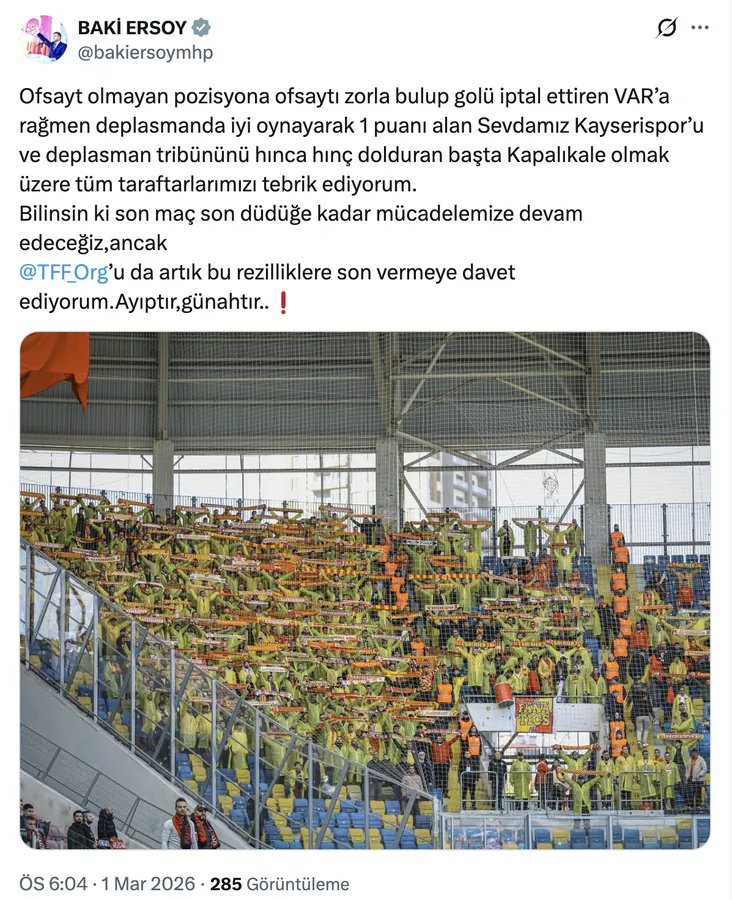 MHP Kayseri Milletvekili Baki Ersoy, Kayserispor’un deplasmanda Gençlerbirliği ile oynadığı karşılaşmanın ardından sosyal medya hesabından dikkat çeken bir açıklama yaptı. Ersoy, ofsayt olmadığı iddia edilen bir pozisyonda VAR müdahalesiyle golün iptal edilmesine tepki göstererek, “Ofsayt olmayan pozisyona ofsaytı zorla bulup golü iptal ettiren VAR’a rağmen deplasmanda iyi oynayarak 1 puanı alan Sevdamız Kayserispor’u ve deplasman tribününü hınca hınç dolduran başta Kapalı Kale olmak üzere tüm taraftarlarımızı tebrik ediyorum” ifadelerini kullandı.