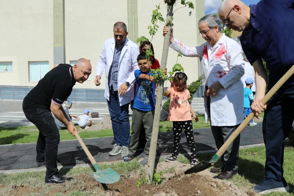 Sağlık çalışanları ve çocukları, "Umuda Bir Fidan" etkinliği kapsamında Talas Belediyesi Gençlik Merkezi önündeki parkta bir araya geldi.