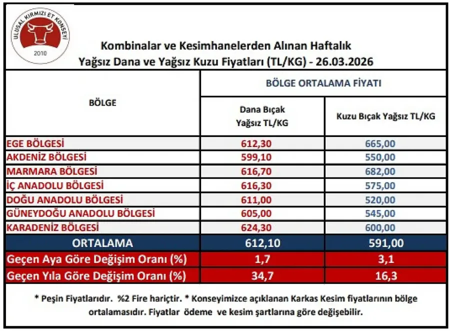 Konseyin mart ayı verilerine göre İç Anadolu’da karkas et fiyatları son haftalarda yukarı yönlü hareket ediyor. 12 Mart tarihinde kilogramı 611,40 TL seviyesinde olan dana bıçak fiyatı, 26 Mart itibarıyla 616,30 TL’ye yükseldi.