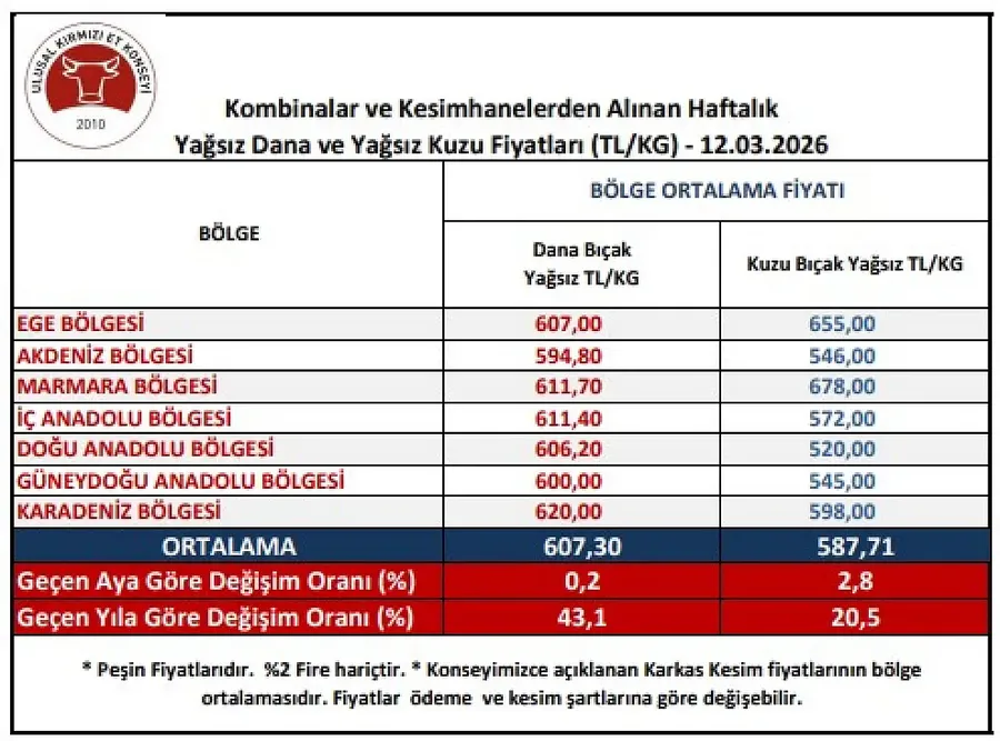 Ulusal Kırmızı Et Konseyi tarafından açıklanan son veriler, İç Anadolu Bölgesi’nde kırmızı et fiyatlarının yükselişini ortaya koydu. Açıklanan rakamlara göre bölgede yağsız dana bıçak fiyatı kilogram başına 616 TL’yi aşarak Türkiye ortalamasının üzerine çıktı.