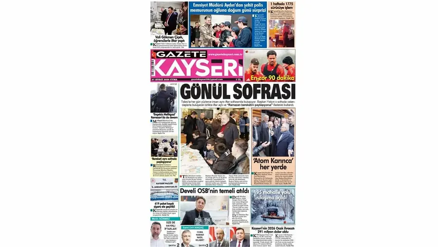 Gazete Kayseri manşetinde ‘Gönül Sofrası’ başlığı ile Talas Belediye Başkanı Mustafa Yalçın’a yer verdi. Talas’ta her gün yüzlerce insan aynı iftar sofrasında buluşuyor. Başkan Yalçın o sofrada vatandaşlarla buluşarak birlikte iftar açtı ve ‘Ramazan bereketini paylaşıyoruz’ ifadesini kullandı.