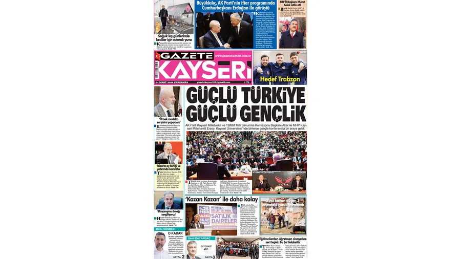 Gazete Kayseri manşetinde ‘Güçlü Türkiye Güçlü Gençlik’ başlığı ile AK Parti Kayseri Milletvekili ve TBMM Milli Savunma Komisyonu Başkanı Hulusi Akar ile MHP Kayseri Milletvekili Baki Ersoy’un Kayseri Üniversitesi’nde gerçekleştirdiği konferansa yer verdi.
