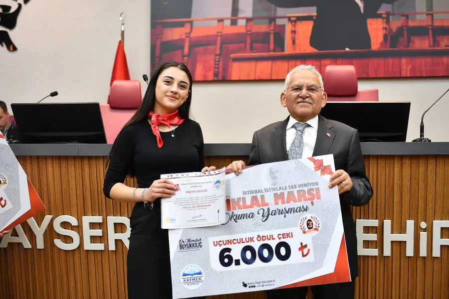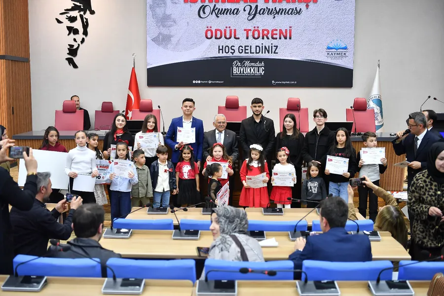 Büyükşehir Belediyesi Kayseri Mesleki Eğitim ve Kültür A.Ş. (KAYMEK) tarafından 12 Mart İstiklal Marşı’nın kabulünün 105’inci yılı dolayısıyla düzenlenen ‘İstikbal İstiklale Ses Veriyor’ İstiklal Marşı Okuma Yarışması’nda ödüller sahiplerini bulurken, dereceye girenlere ödüllerini Başkan Büyükkılıç takdim etti. Büyükşehir Belediyesi Meclis Salonu’nda gerçekleşen ‘İstikbal İstiklale Ses Veriyor’ İstiklal Marşı Okuma Yarışması Ödül Töreni’ne Başkan Büyükkılıç’ın yanı sıra, Büyükşehir Belediyesi Genel Sekreter Yardımcısı Fatih Temeltaş, daire başkanları ile öğrenciler ve aileleri katıldı.