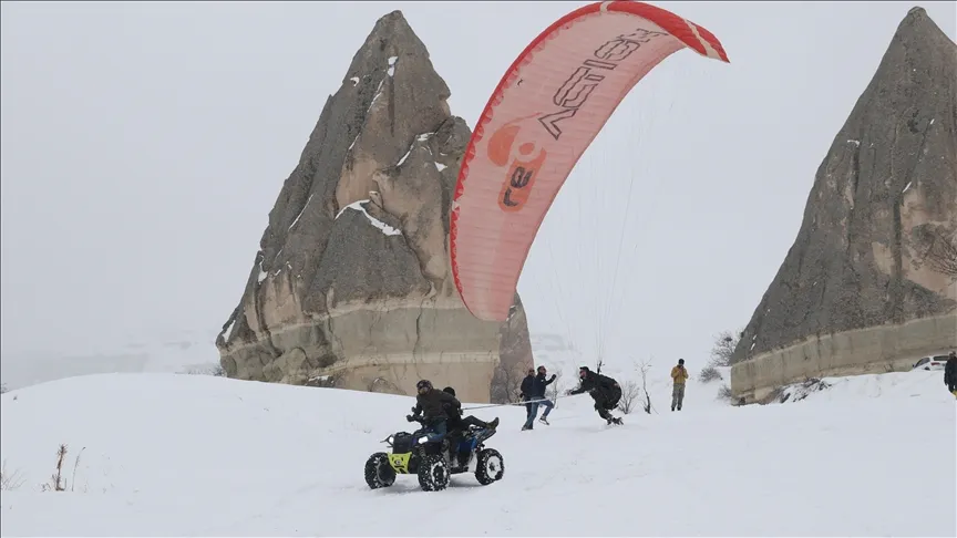 "İçindeki çocuğu ortaya çıkar" sloganıyla peribacaları arasında yapılan programda, kimi katılımcılar snowboard ve kızakla, kimisi ise iş makinesi ve ATV arazi aracına bağlanan iplere tutunarak kaydı.