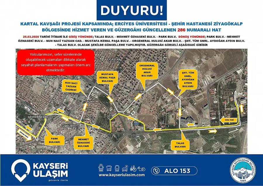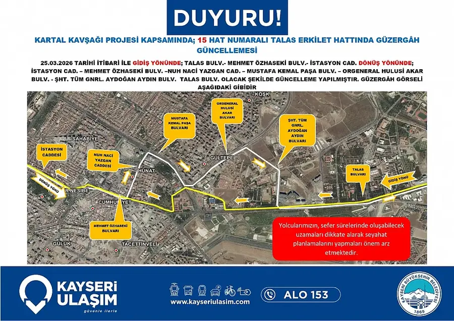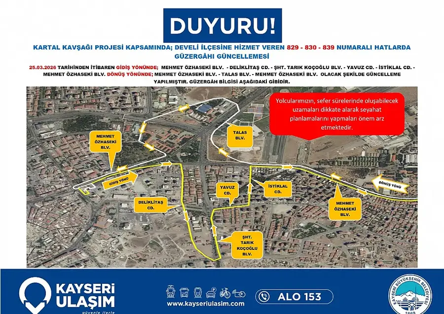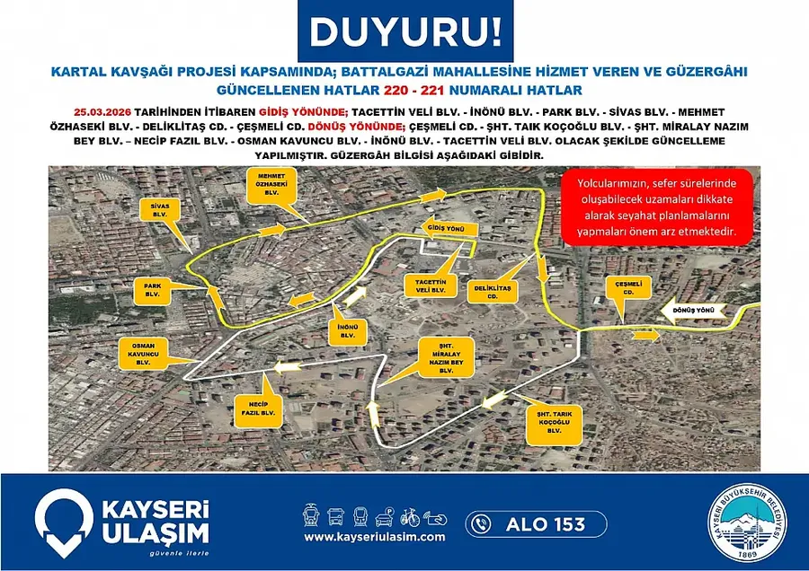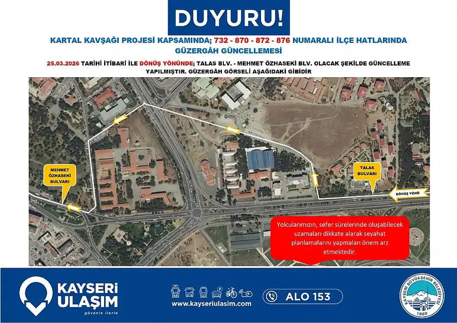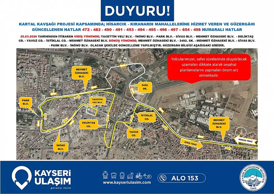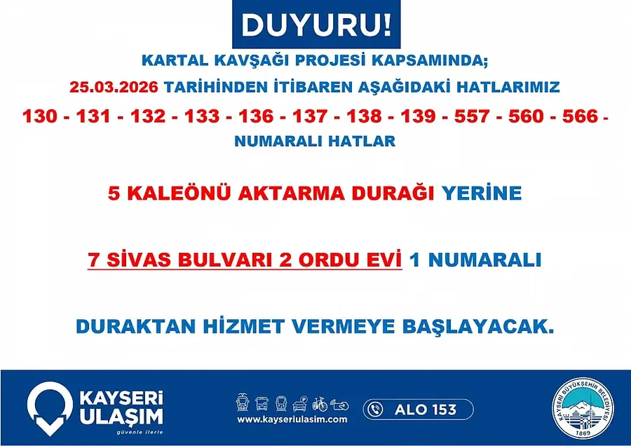 Kartal Katlı Kavşağı çalışmaları nedeniyle Kayseri’de toplu taşıma güzergahları değişiyor. Yeni düzenleme 26 Mart itibariyle yürürlüğe giriyor… Detaylar Kayseri Haber'de...