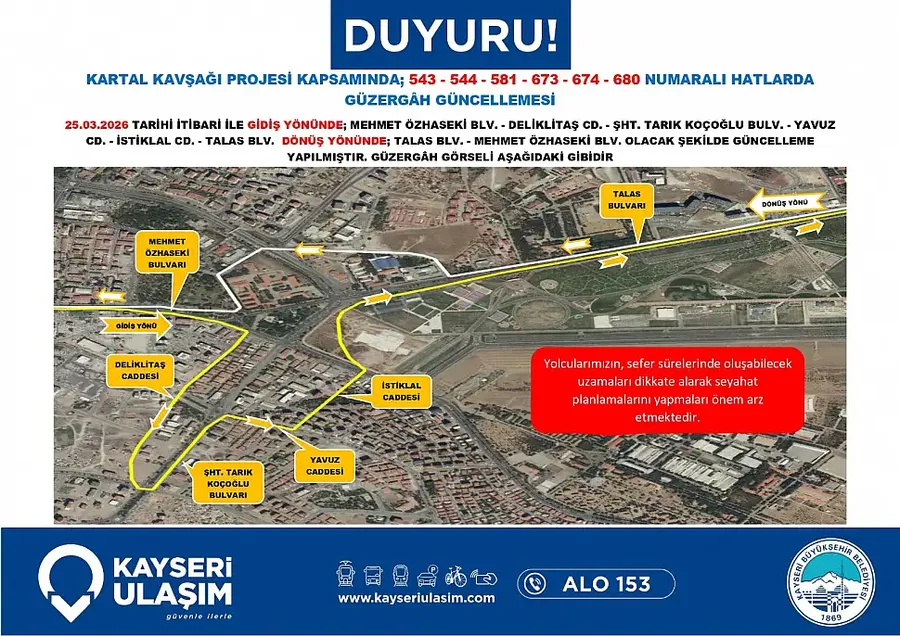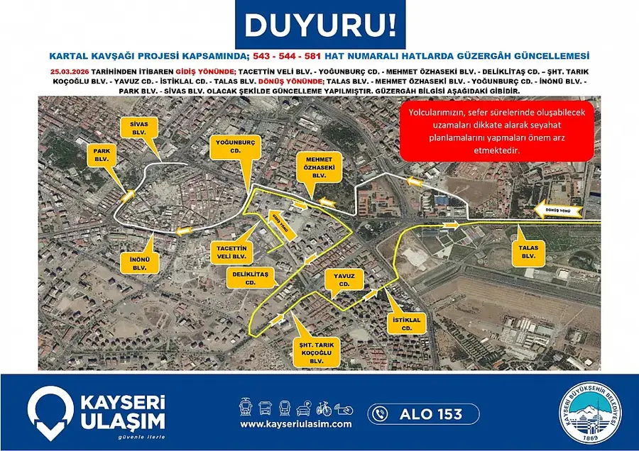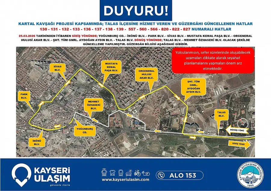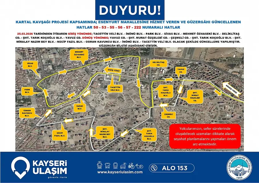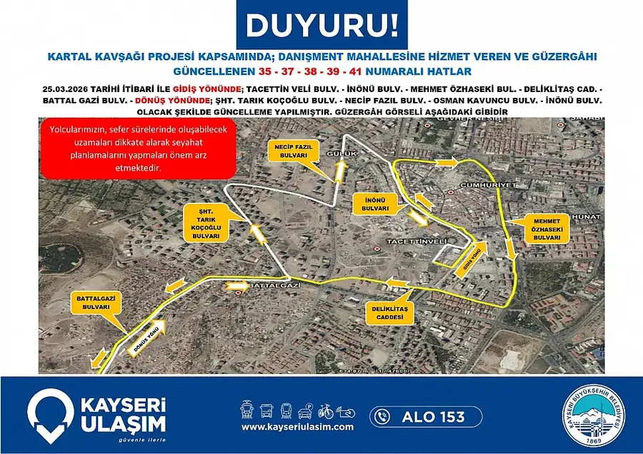 Kayseri Büyükşehir Belediyesi tarafından başlatılan Kartal Katlı Kavşağı çalışmaları, şehir içi ulaşımı doğrudan etkilemeye başladı. Proje kapsamında sadece araç trafiği değil, toplu taşıma güzergahlarında da kapsamlı değişikliklere gidildi.