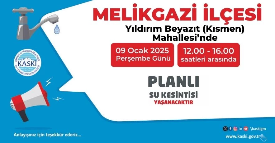 Kayseri Su ve Kanalizasyon İdaresi, Yıldırım Beyazıt Mahallesi'nde 4 saat planlı bir su kesintisi yapılacağını duyurdu.
