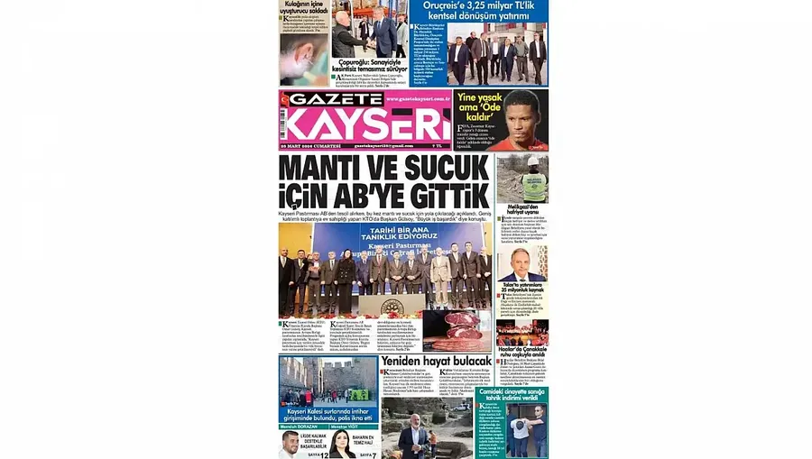 Gazete Kayseri manşetinde ‘Mantı ve Sucuk İçin AB’ye Gittik’ başlığı ile Kayseri Ticaret Odası Başkanı Ömer Gülsoy’un açıklamalarına yer verdi. Kayseri Pastırması AB’den tescil alırken, bu kez mantı ve sucuk için yola çıkılacağı açıklandı. Geniş toplantıya ev sahipliği yapan KTO Başkanı Gülsoy, ‘Büyük iş başardık’ dedi.