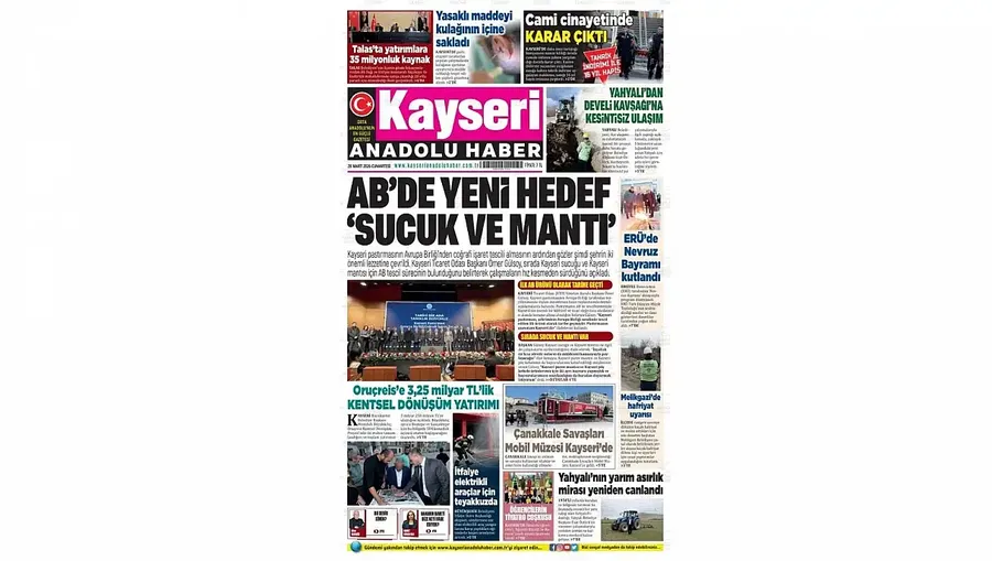 Anadolu Haber manşetinde ‘AB’de Yeni Hedef ‘Sucuk ve Mantı’’ başlığı ile KTO Başkanı Ömer Gülsoy’un açıklamalarına yer verdi. Kayseri pastırmasının Avrupa Birliği’nden coğrafi işaret tescili almasının ardından gözler şimdi şehrin iki önemli lezzetine çevrildi. KTO Başkanı Gülsoy, sırada Kayseri sucuğu ve Kayseri mantısı için AB tescil sürecinin bulunduğunu belirterek çalışmaların hız kesmeden sürdüğünü açıkladı.