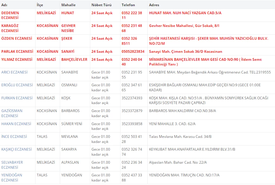 Kayseri'de vatandaşların acil sağlık ihtiyaçları için nöbetçi eczaneler önemli bir yere sahip. Kayseri’nin bugünkü nöbetçi eczanelerini sizler için derledik. 10 Aralık Salı nöbetçi eczaneler listesine buradan ulaşabilirsiniz. İşte 10 Aralık nöbetçi eczaneler…
