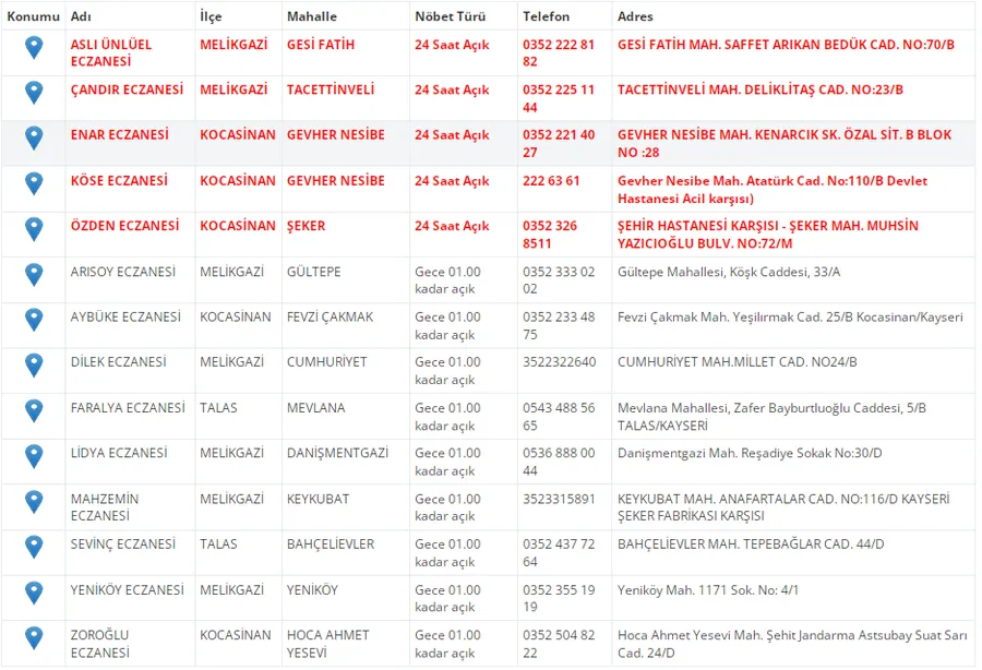 Kayseri'de vatandaşların acil sağlık ihtiyaçları için nöbetçi eczaneler önemli bir yere sahip. Kayseri’nin bugünkü nöbetçi eczanelerini sizler için derledik. 10 Aralık Çarşamba nöbetçi eczaneler listesine buradan ulaşabilirsiniz. İşte 10 Aralık nöbetçi eczaneler…
