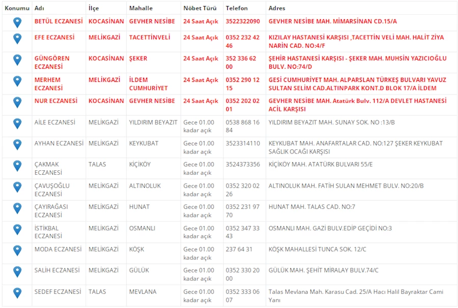 Kayseri'de vatandaşların acil sağlık ihtiyaçları için nöbetçi eczaneler önemli bir yere sahip. Kayseri’nin bugünkü nöbetçi eczanelerini sizler için derledik. 10 Eylül Çarşamba nöbetçi eczaneler listesine buradan ulaşabilirsiniz. İşte 10 Eylül nöbetçi eczaneler…