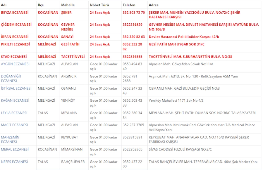 Kayseri'de vatandaşların acil sağlık ihtiyaçları için nöbetçi eczaneler önemli bir yere sahip. Kayseri’nin bugünkü nöbetçi eczanelerini sizler için derledik. 11 Aralık Çarşamba nöbetçi eczaneler listesine buradan ulaşabilirsiniz. İşte 11 Aralık nöbetçi eczaneler…