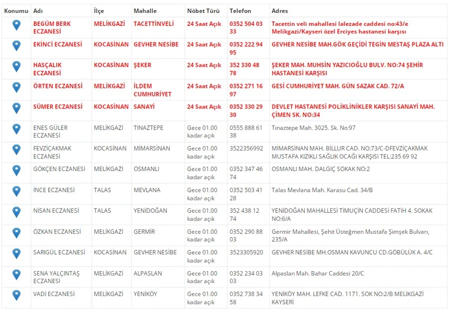 Kayseri'de vatandaşların acil sağlık ihtiyaçları için nöbetçi eczaneler önemli bir yere sahip. Kayseri’nin bugünkü nöbetçi eczanelerini sizler için derledik. 11 Aralık Perşembe nöbetçi eczaneler listesine buradan ulaşabilirsiniz. İşte 11 Aralık nöbetçi eczaneler…