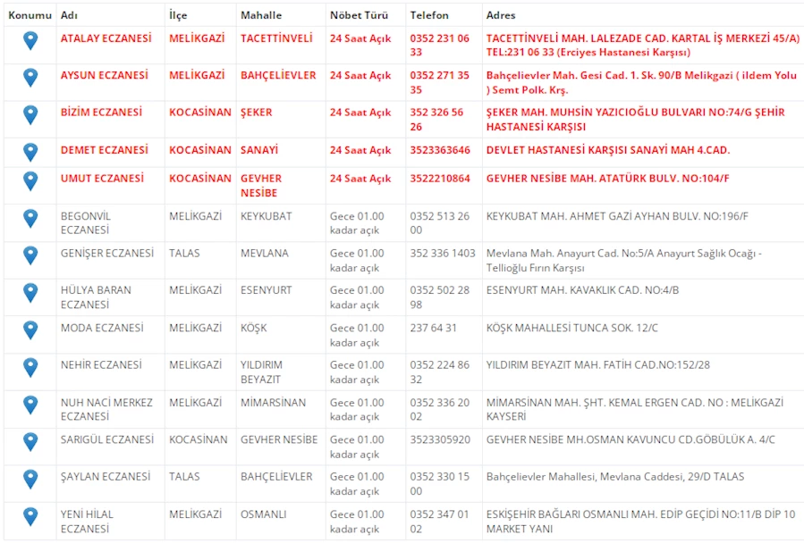 Kayseri'de vatandaşların acil sağlık ihtiyaçları için nöbetçi eczaneler önemli bir yere sahip. Kayseri’nin bugünkü nöbetçi eczanelerini sizler için derledik. 13 Ağustos Çarşamba nöbetçi eczaneler listesine buradan ulaşabilirsiniz. İşte 13 Ağustos nöbetçi eczaneler…