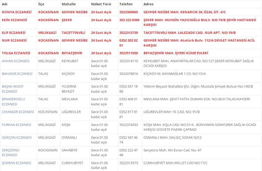 Öte yandan nöbetçi eczaneler, anlık üşütme, zehirlenme vakaları veya ilaçların yan etkileri gibi acil sağlık sorunlarına da müdahale etme konusunda da yetkinlik sahibi olurken, bugünkü nöbetçi eczaneleri sizler için derledik. Kayseri'de bugün hangi nöbetçi eczaneler açık?