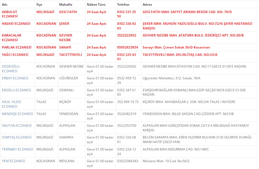 Kayseri'de vatandaşların acil sağlık ihtiyaçları için nöbetçi eczaneler önemli bir yere sahip. Kayseri’nin bugünkü nöbetçi eczanelerini sizler için derledik. 17 Aralık Salı nöbetçi eczaneler listesine buradan ulaşabilirsiniz. İşte 17 Aralık nöbetçi eczaneler…