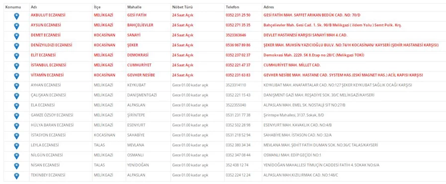 Kayseri'de vatandaşların acil sağlık ihtiyaçları için nöbetçi eczaneler önemli bir yere sahip. Kayseri’nin bugünkü nöbetçi eczanelerini sizler için derledik. 19 Temmuz Cumartesi nöbetçi eczaneler listesine buradan ulaşabilirsiniz. İşte 19 Temmuz nöbetçi eczaneler…