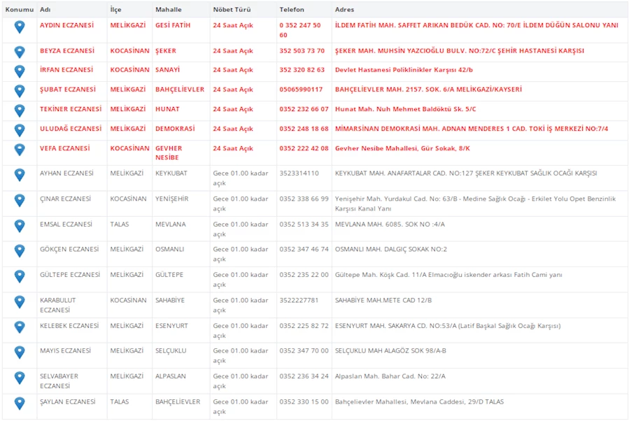 Kayseri'de vatandaşların acil sağlık ihtiyaçları için nöbetçi eczaneler önemli bir yere sahip. Kayseri’nin bugünkü nöbetçi eczanelerini sizler için derledik. 1 Mart Cumartesi nöbetçi eczaneler listesine buradan ulaşabilirsiniz. İşte 1 Mart nöbetçi eczaneler…