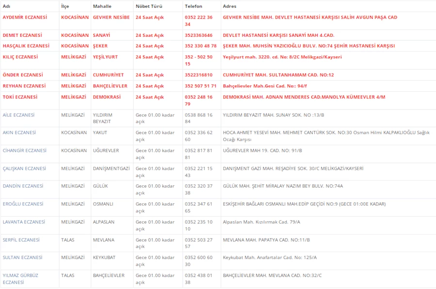 Kayseri'de vatandaşların acil sağlık ihtiyaçları için nöbetçi eczaneler önemli bir yere sahip. Kayseri’nin bugünkü nöbetçi eczanelerini sizler için derledik. 21 Aralık Cumartesi nöbetçi eczaneler listesine buradan ulaşabilirsiniz. İşte 21 Aralık nöbetçi eczaneler…