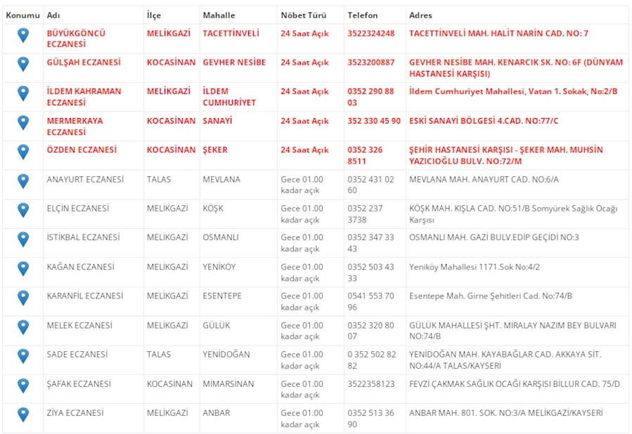 Kayseri'de vatandaşların acil sağlık ihtiyaçları için nöbetçi eczaneler önemli bir yere sahip. Kayseri’nin bugünkü nöbetçi eczanelerini sizler için derledik. 21 Mart Cuma nöbetçi eczaneler listesine buradan ulaşabilirsiniz. İşte 21 Mart nöbetçi eczaneler…