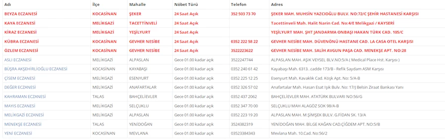 Öte yandan nöbetçi eczaneler, anlık üşütme, zehirlenme vakaları veya ilaçların yan etkileri gibi acil sağlık sorunlarına da müdahale etme konusunda da yetkinlik sahibi olurken, bugünkü nöbetçi eczaneleri sizler için derledik. Kayseri’de bugün hangi nöbetçi eczaneler açık?
