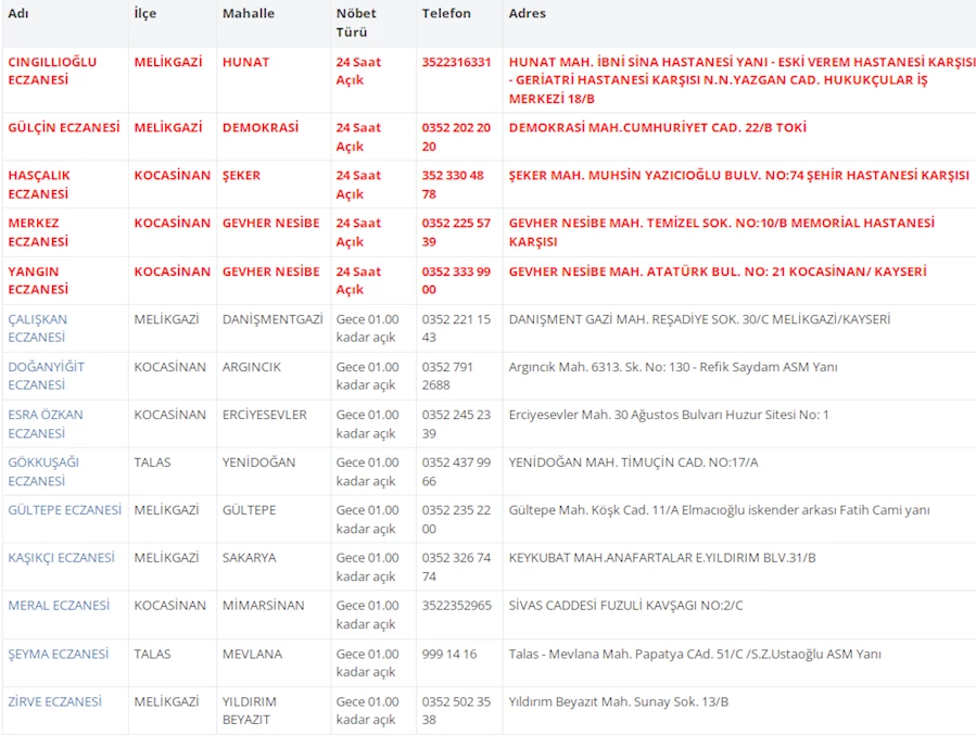 Öte yandan nöbetçi eczaneler, anlık üşütme, zehirlenme vakaları veya ilaçların yan etkileri gibi acil sağlık sorunlarına da müdahale etme konusunda da yetkinlik sahibi olurken, bugünkü nöbetçi eczaneleri sizler için derledik. Kayseri'de bugün hangi nöbetçi eczaneler açık?