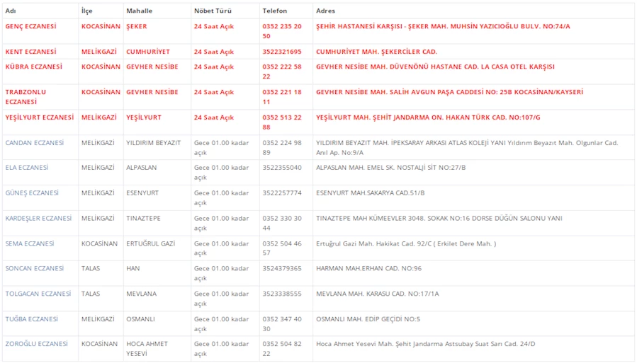 Kayseri'de vatandaşların acil sağlık ihtiyaçları için nöbetçi eczaneler önemli bir yere sahip. Kayseri'nin bugünkü nöbetçi eczanelerini sizler için derledik. 23 Aralık Pazartesi nöbetçi eczaneler listesine buradan ulaşabilirsiniz. İşte 23 Aralık nöbetçi eczaneler…