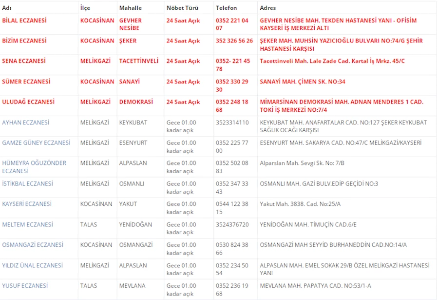 Kayseri'de vatandaşların acil sağlık ihtiyaçları için nöbetçi eczaneler önemli bir yere sahip. Kayseri’nin bugünkü nöbetçi eczanelerini sizler için derledik. 24 Aralık Salı nöbetçi eczaneler listesine buradan ulaşabilirsiniz. İşte 24 Aralık nöbetçi eczaneler…