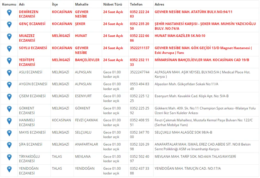 Kayseri'de vatandaşların acil sağlık ihtiyaçları için nöbetçi eczaneler önemli bir yere sahip. Kayseri’nin bugünkü nöbetçi eczanelerini sizler için derledik. 24 Eylül Çarşamba nöbetçi eczaneler listesine buradan ulaşabilirsiniz. İşte 24 Eylül nöbetçi eczaneler…