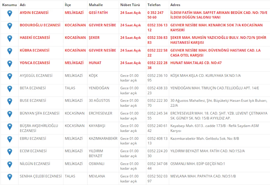 Kayseri'de vatandaşların acil sağlık ihtiyaçları için nöbetçi eczaneler önemli bir yere sahip. Kayseri’nin bugünkü nöbetçi eczanelerini sizler için derledik. 24 Ocak Cuma nöbetçi eczaneler listesine buradan ulaşabilirsiniz. İşte 24 Ocak nöbetçi eczaneler…