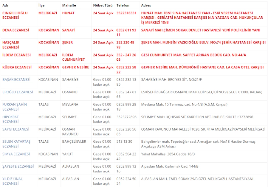 Öte yandan nöbetçi eczaneler, anlık üşütme, zehirlenme vakaları veya ilaçların yan etkileri gibi acil sağlık sorunlarına da müdahale etme konusunda da yetkinlik sahibi olurken, bugünkü nöbetçi eczaneleri sizler için derledik. Kayseri'de bugün hangi nöbetçi eczaneler açık?