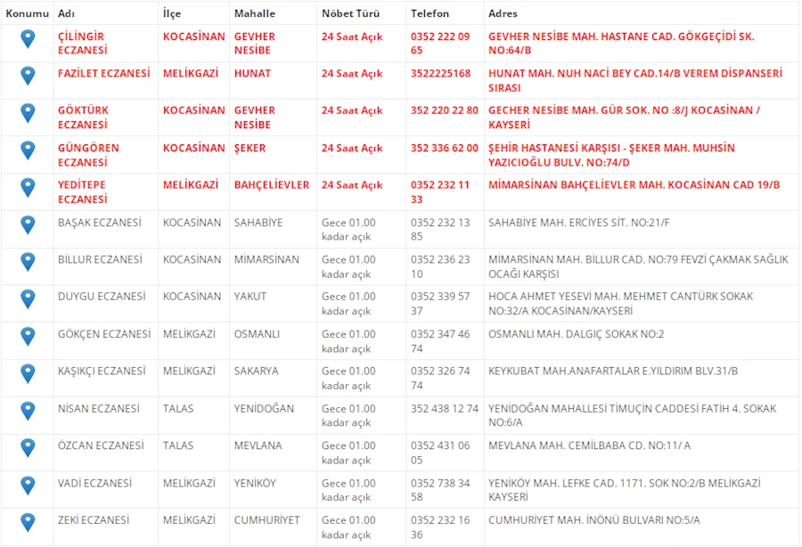 Kayseri'de vatandaşların acil sağlık ihtiyaçları için nöbetçi eczaneler önemli bir yere sahip. Kayseri’nin bugünkü nöbetçi eczanelerini sizler için derledik. 25 Mart Salı nöbetçi eczaneler listesine buradan ulaşabilirsiniz. İşte 25 Mart nöbetçi eczaneler…