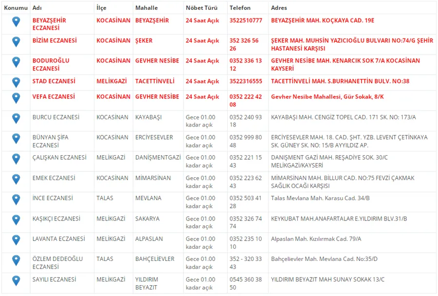 Kayseri'de vatandaşların acil sağlık ihtiyaçları için nöbetçi eczaneler önemli bir yere sahip. Kayseri’nin bugünkü nöbetçi eczanelerini sizler için derledik. 28 Eylül Pazar nöbetçi eczaneler listesine buradan ulaşabilirsiniz. İşte 28 Eylül nöbetçi eczaneler…