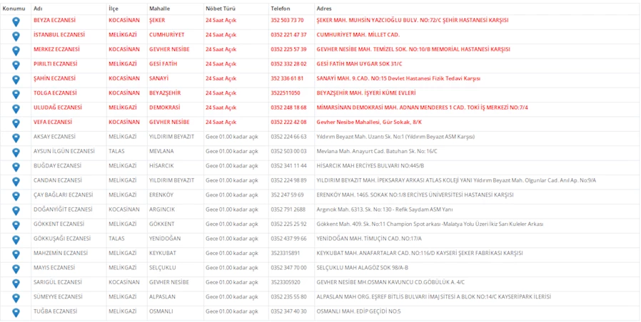 Kayseri'de vatandaşların acil sağlık ihtiyaçları için nöbetçi eczaneler önemli bir yere sahip. Kayseri’nin bugünkü nöbetçi eczanelerini sizler için derledik. 29 Mart Cumartesi nöbetçi eczaneler listesine buradan ulaşabilirsiniz. İşte 29 Mart nöbetçi eczaneler…