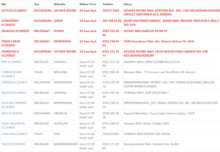 Öte yandan nöbetçi eczaneler, anlık üşütme, zehirlenme vakaları veya ilaçların yan etkileri gibi acil sağlık sorunlarına da müdahale etme konusunda da yetkinlik sahibi olurken, bugünkü nöbetçi eczaneleri sizler için derledik. Kayseri'de bugün hangi nöbetçi eczaneler açık?