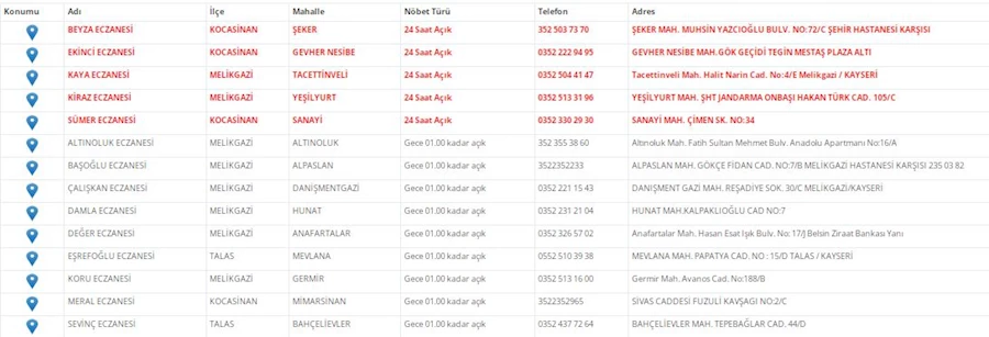 Kayseri'de vatandaşların acil sağlık ihtiyaçları için nöbetçi eczaneler önemli bir yere sahip. Kayseri’nin bugünkü nöbetçi eczanelerini sizler için derledik. 30 Mayıs Cuma nöbetçi eczaneler listesine buradan ulaşabilirsiniz. İşte 30 Mayıs nöbetçi eczaneler…