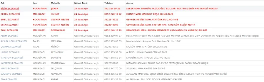 Kayseri'de vatandaşların acil sağlık ihtiyaçları için nöbetçi eczaneler önemli bir yere sahip. Kayseri’nin bugünkü nöbetçi eczanelerini sizler için derledik. 3 Aralık Salı nöbetçi eczaneler listesine buradan ulaşabilirsiniz. İşte 3 Aralık nöbetçi eczaneler…