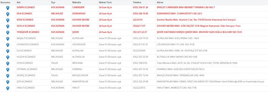 Kayseri'de vatandaşların acil sağlık ihtiyaçları için nöbetçi eczaneler önemli bir yere sahip. Kayseri’nin bugünkü nöbetçi eczanelerini sizler için derledik. 4 Mayıs Pazar nöbetçi eczaneler listesine buradan ulaşabilirsiniz. İşte 4 Mayıs nöbetçi eczaneler…