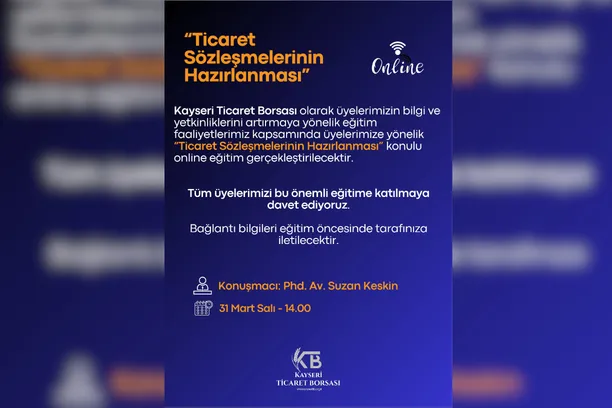 Kayseri Ticaret Borsası, üyelerinin bilgi ve yetkinliklerini artırmaya yönelik eğitim faaliyetlerine devam ediyor. Bu kapsamda “Ticaret Sözleşmelerinin Hazırlanması” konulu online eğitim programı düzenlenecek.