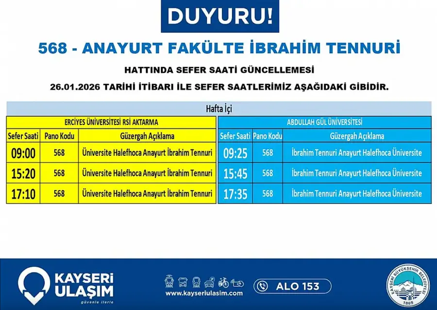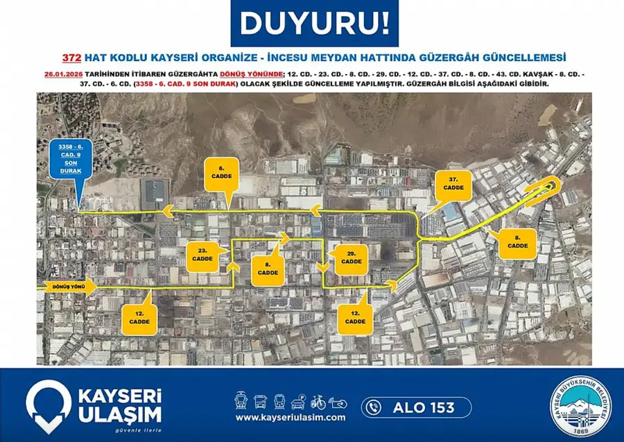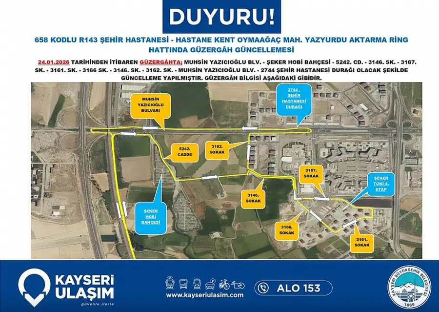 Kayseri Büyükşehir Belediyesi Kayseri Ulaşım A.Ş. tarafından yapılan açıklamaya göre, Kayseri genelinde birçok ilçe ve mahalleyi kapsayan ulaşım düzenlemeleri 24 Ocak 2026 Cumartesi günü itibarıyla yürürlüğe girdi.