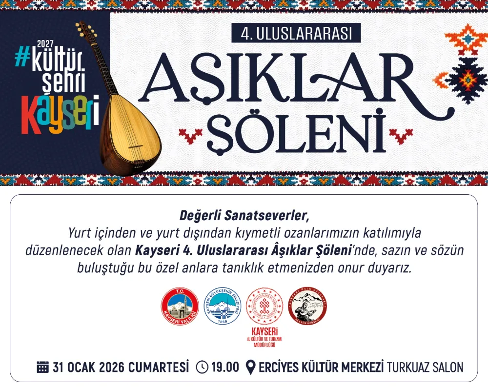 Türk halk edebiyatının önemli bir geleneği olan aşıklık kültürü, Kayseri’de sanatseverlerle buluşmaya hazırlanıyor. Kayseri Valiliği, Büyükşehir Belediyesi, İl Kültür ve Turizm Müdürlüğü ile Kayseri Halk Ozanları Kültür Derneği iş birliğiyle düzenlenecek 4’üncü Uluslararası Aşıklar Şöleni, 31 Ocak Cumartesi günü saat 19.00’da Erciyes Kültür Merkezi Turkuaz Salonu’nda gerçekleştirilecek. Şölene Türkiye’nin farklı illerinin yanı sıra Azerbaycan, Özbekistan, Kırgızistan, Kazakistan ve Karakalpakistan’dan usta aşık ve ozanlar katılacak. Programda Anadolu’nun güçlü aşık geleneğini temsil eden sanatçılar ile Türk dünyasının önemli isimleri yer alacak.