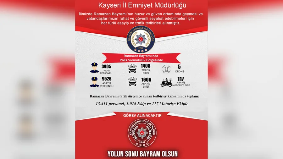Kayseri İl Emniyet Müdürlüğü, yaptığı açıklamada şehirde bayramın huzur içinde geçmesi için tüm hazırlıkların tamamlandığını vurgulayarak, vatandaşların güvenli bir bayram geçirmesi için çalışmaların aralıksız süreceğini belirtti.