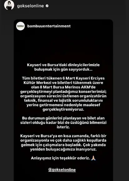 Açıklamada, konser için plan yapan ve bilet satın alan dinleyicilerden özür dilenirken, Kayseri’deki hayranlarla en kısa zamanda yeniden buluşmak için çalışmaların başladığı kaydedildi. Yetkililer, farklı bir organizasyonla ve daha sağlıklı koşullarda Kayseri’de konser düzenlenmesi için girişimlerin sürdüğünü belirtti.
